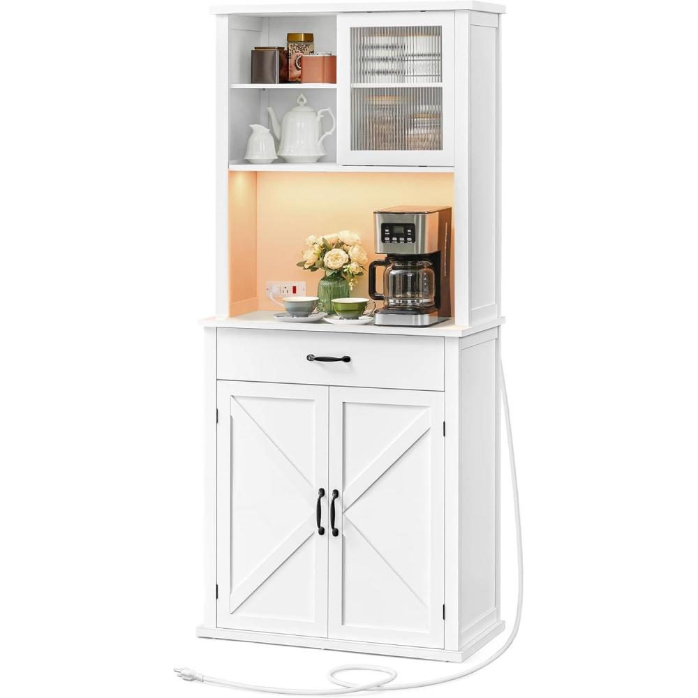 VASAGLE LIRY Collection – 71-Inch Tall Kitchen Pantry Cabinet with Lights and Charging Station, Coffee Bar Cabinet with Doors and Drawer, Farmhouse Style, Adjustable Shelves, Cloud White UBBK363W11(Cloud White)