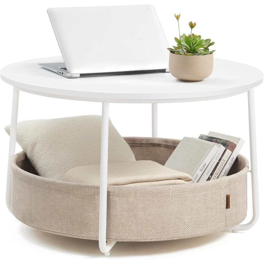 VASAGLE LILEA Collection – Coffee Table with Storage, Round Center Table for Living Room with Fabric Basket, Modern Style, Metal Frame, Matte White and Camel Brown ULCT244W10(Matte White Camel Brown)