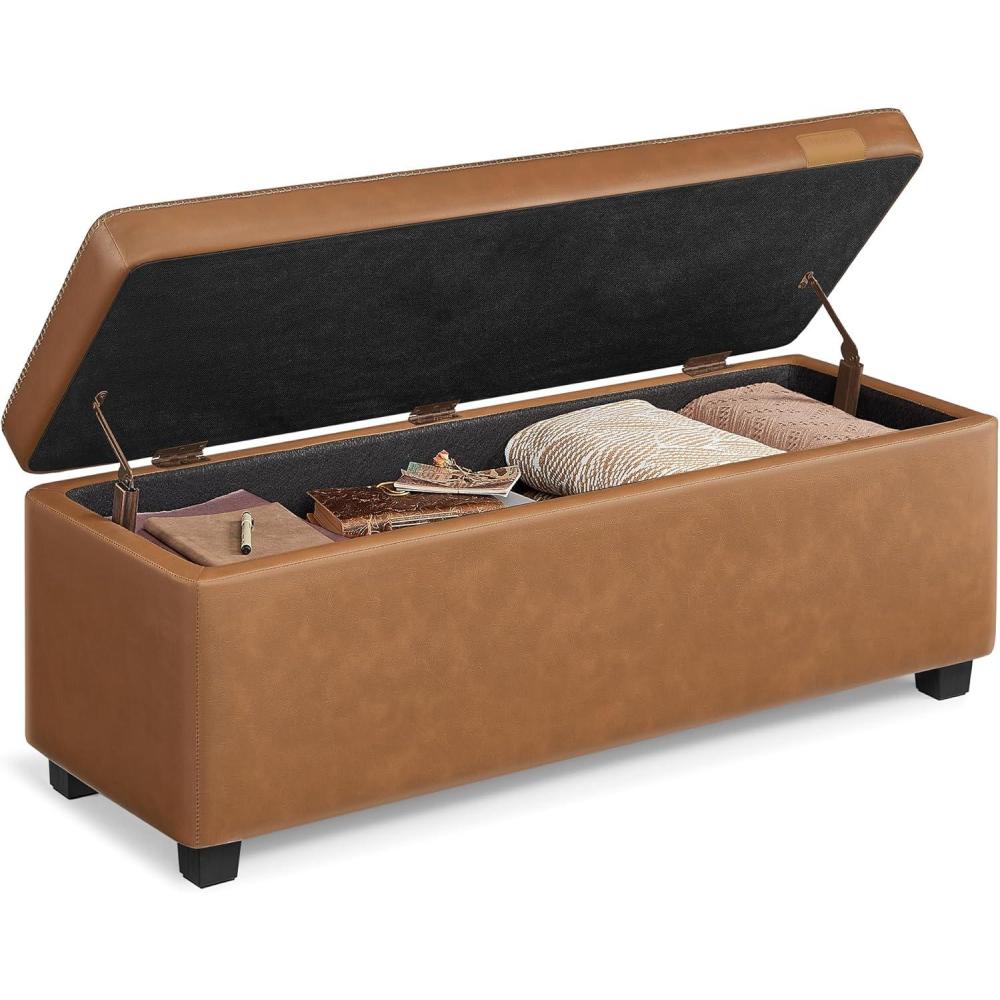 VASAGLE EKHO Collection – Storage Ottoman Bench, Entryway Bedroom Bench, 25 Gallons, Synthetic Leather with Stitching, Mid-Century Modern, Safety Hinges, Loads 660 lb, Ink Black ULOM075B01(Caramel Brown)