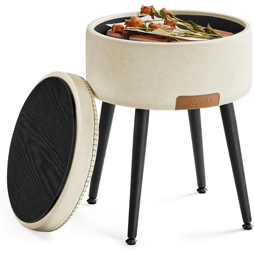 VASAGLE EKHO Collection – Storage Ottoman, Vanity Chair Stool, Synthetic Leather with Stitching, Mid-Century Modern, Round Storage Seat with Steel Legs, Loads 330 lb, Ink Black ULOM005B01(Cream White)