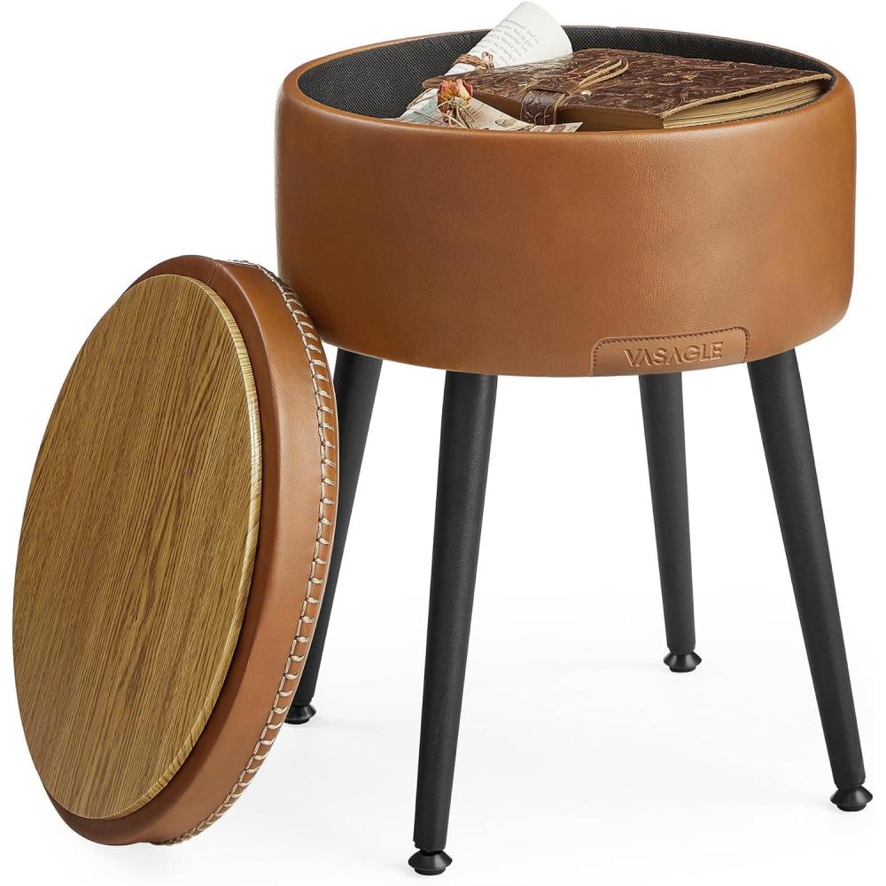 VASAGLE EKHO Collection – Storage Ottoman, Vanity Chair Stool, Synthetic Leather with Stitching, Mid-Century Modern, Round Storage Seat with Steel Legs, Loads 330 lb, Ink Black ULOM005B01(Caramel Brown)