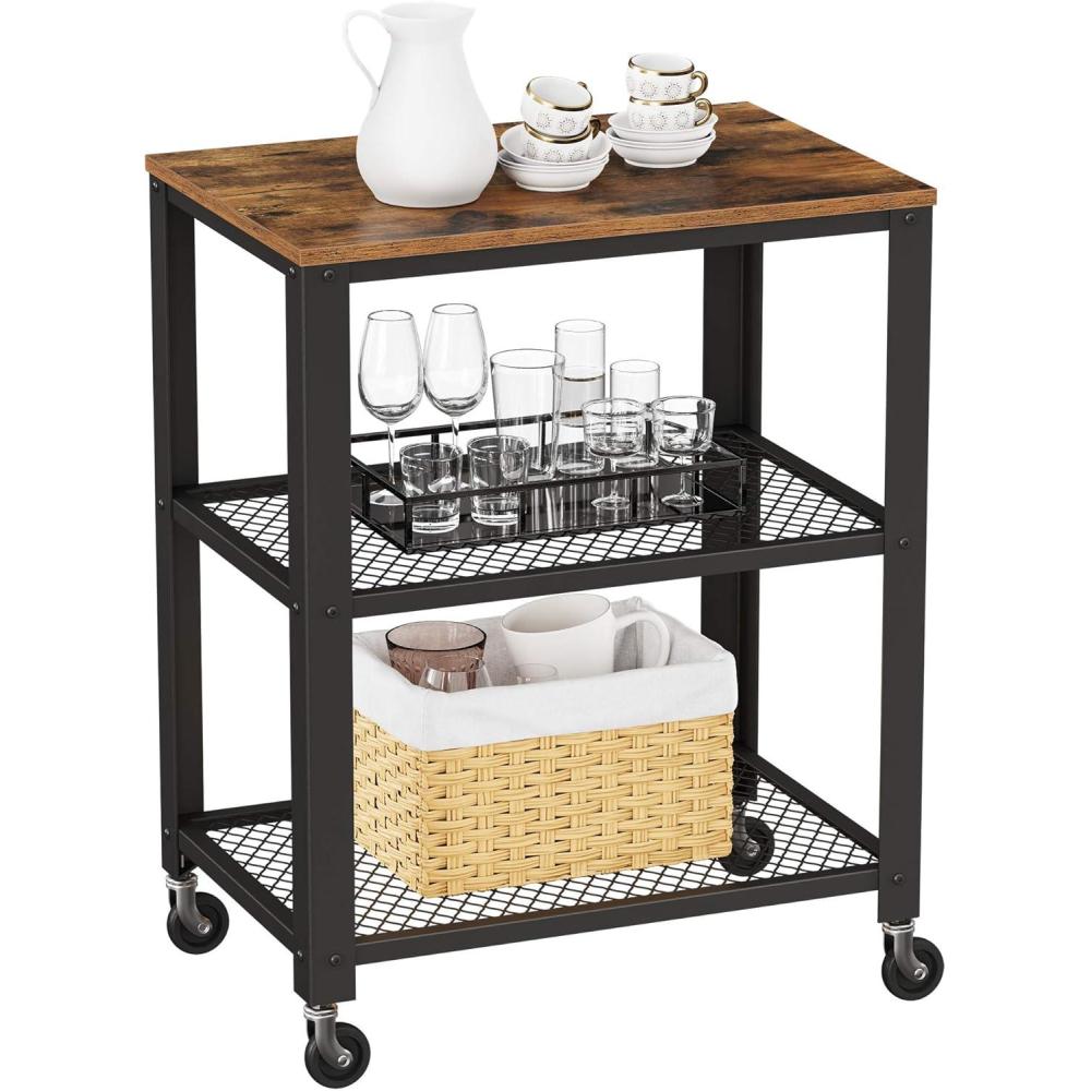 VASAGLE BRYCE Serving Cart, 3-Tier Kitchen Utility Cart on Wheels with Storage, for Living Room, Accent Furniture with Steel Frame, Industrial, Rustic Brown and Ink Black ULRC78X(Rustic Brown Ink Black)