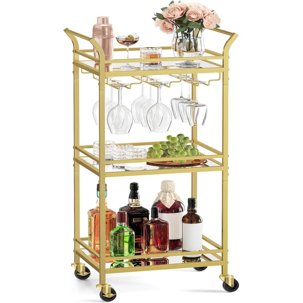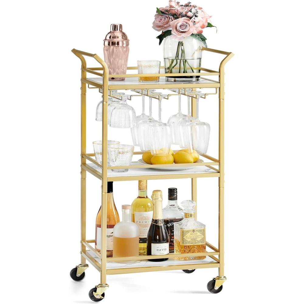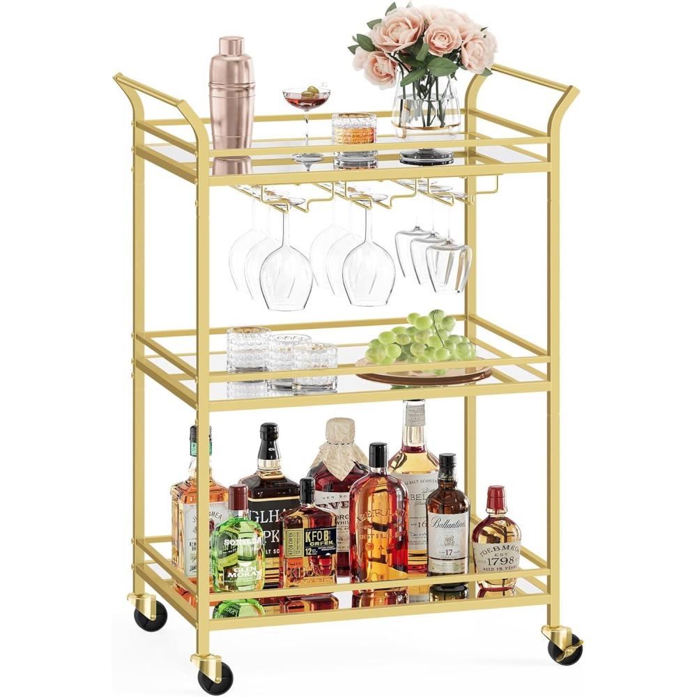 VASAGLE Bar Cart, Home Bar Serving Cart with 3 Tiers, Kitchen Shelf with Wine Rack, Glass Holders, for Small Spaces, Dining Room, Living Room, Pale Gold ULRC101A01