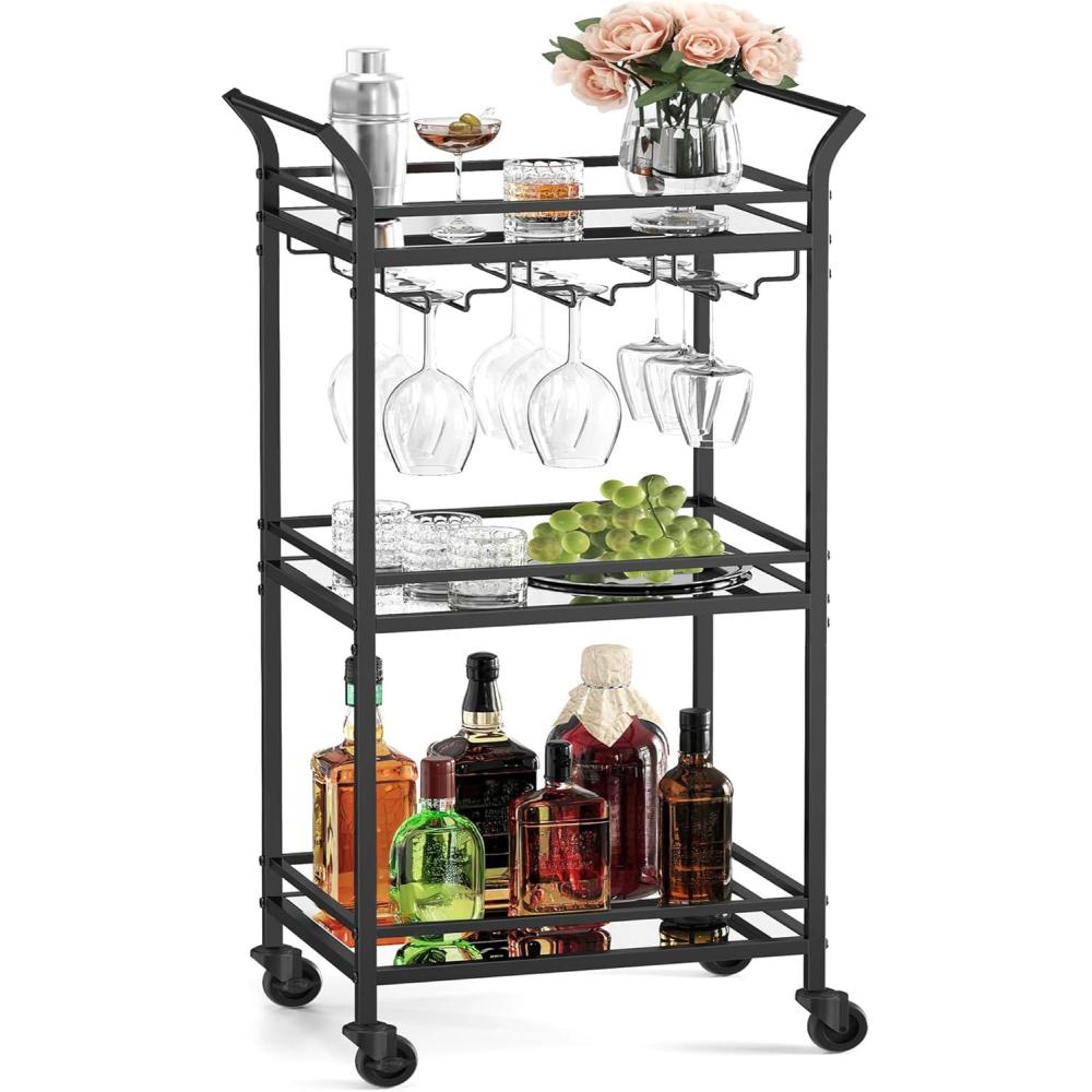 VASAGLE Bar Cart with 3-Tier Shelf, Wine & Glass Holders, Mini Bar for Small Spaces, Black
