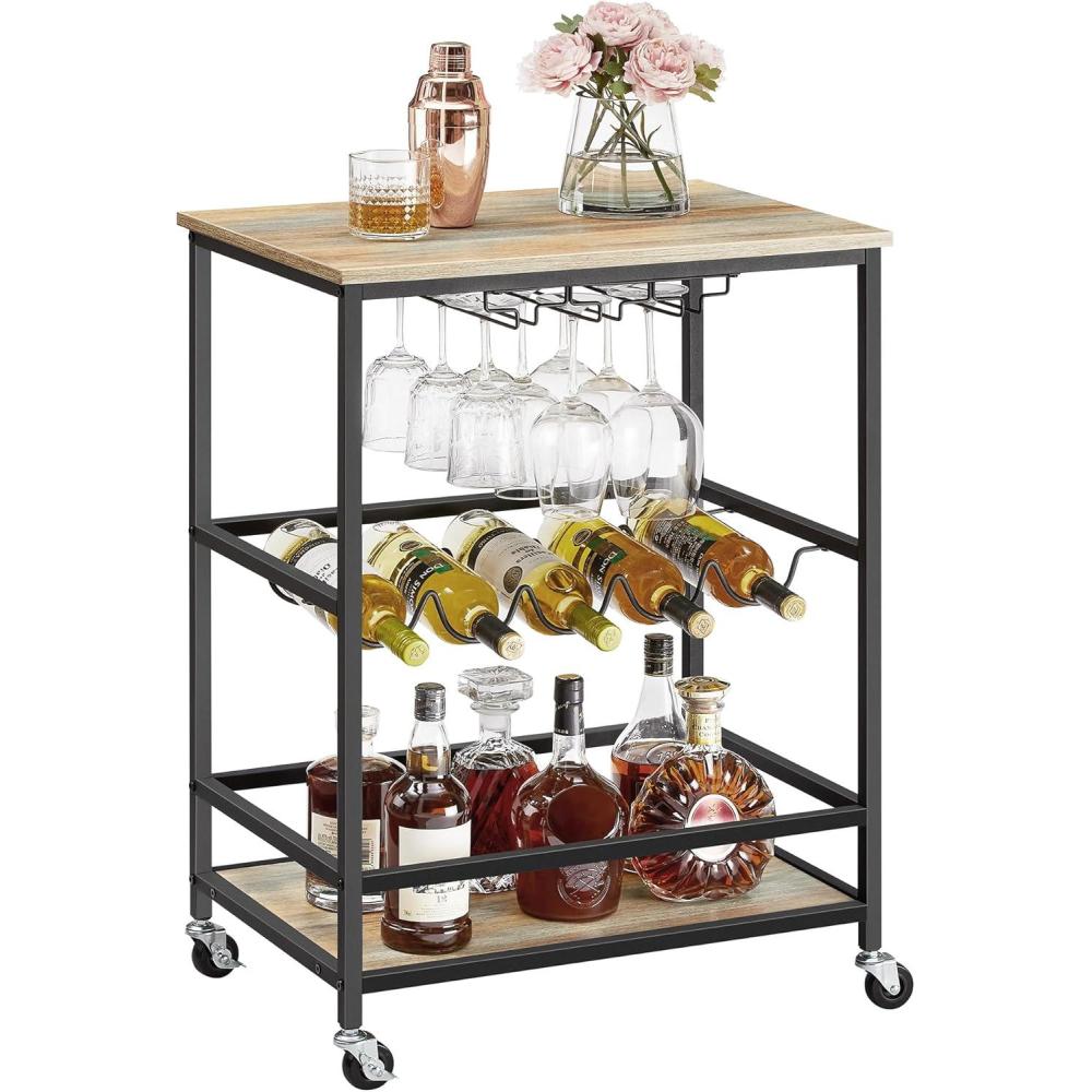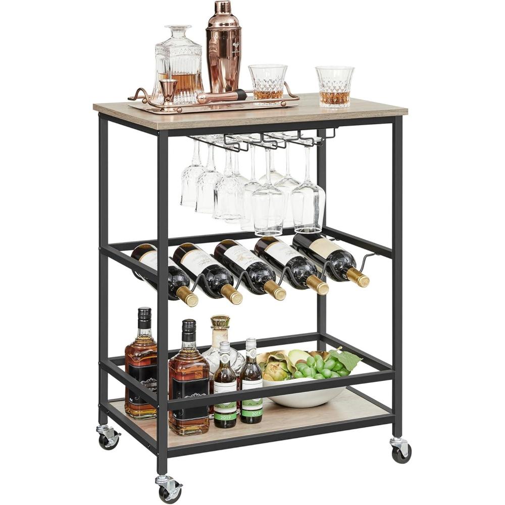 VASAGLE Bar Cart, Serving Cart with Wheels, Glass Stemware Rack and Wine Bottle Holders, 15.7 x 23.6 x 32.3 Inches, Industrial, Rustic Brown and Black ULRC087B01(Greige)