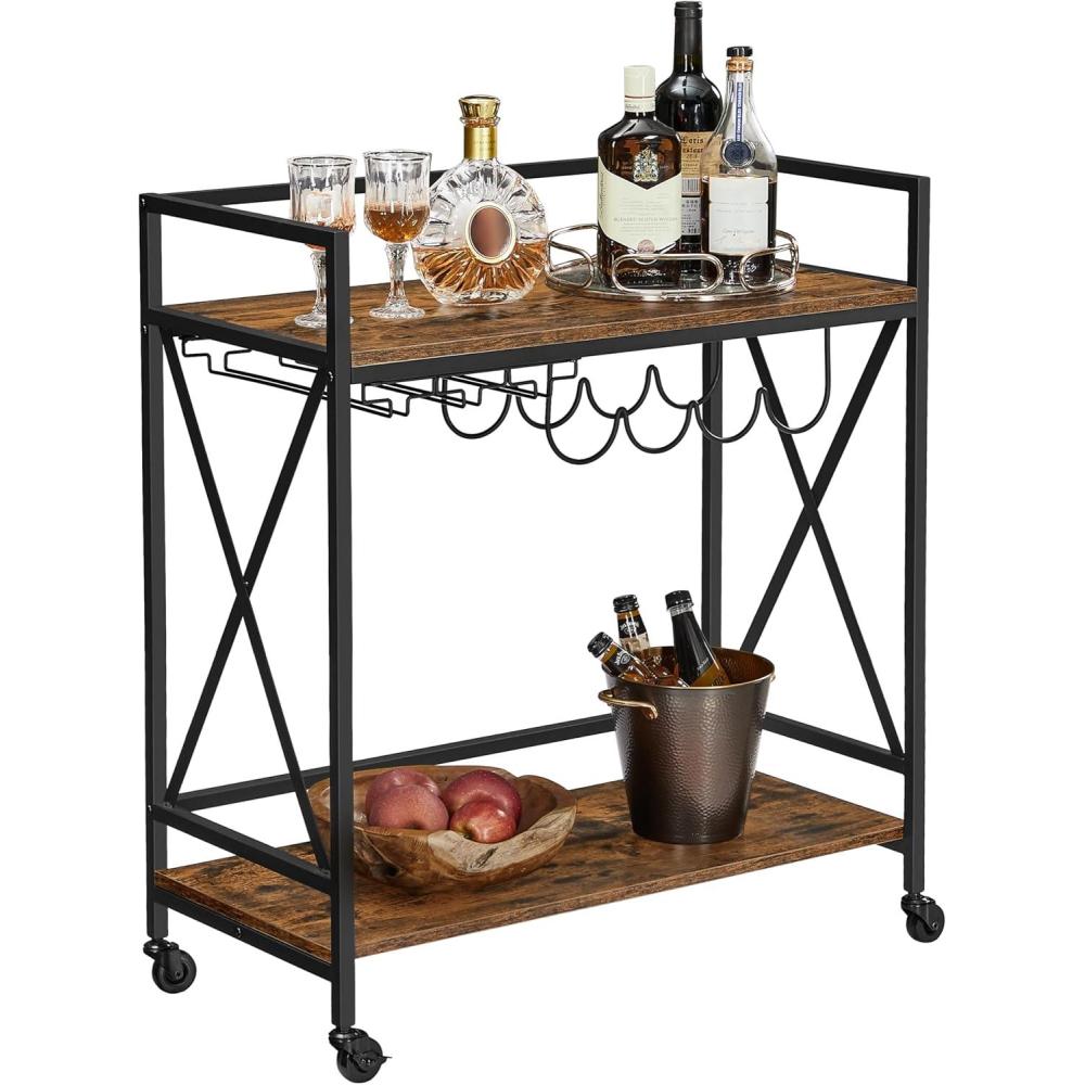 VASAGLE Bar Cart, Serving Cart with Wheels, Glass Stemware Rack and Wine Bottle Holders, 15.7 x 23.6 x 32.3 Inches, Industrial, Rustic Brown and Black ULRC087B01(Rustic Brown)