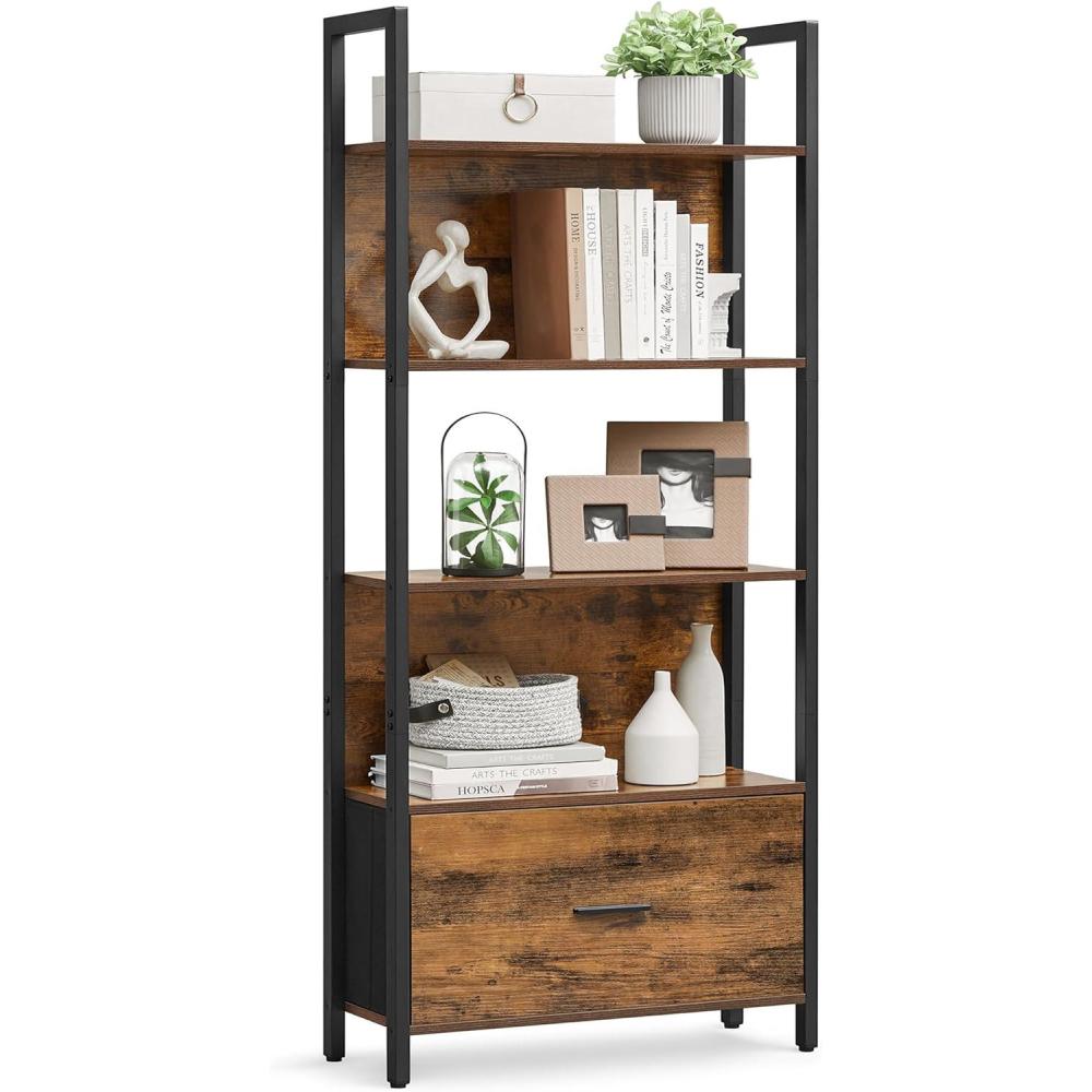 VASAGLE 5-Tier Bookshelf, Book Shelf with Drawer, Industrial Bookcase, with Steel Frame, for Living Room, Home Office, Bedroom, 9.4 x 23.6 x 65 Inches, Rustic Brown and Black ULLS147B01(23.6″W x 65″H)
