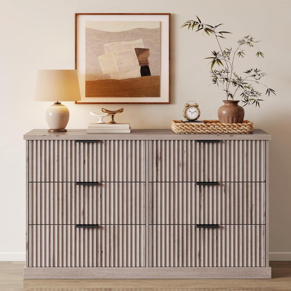 VASAGLE MAXE Collection – 6-Drawer Double Dresser for Bedroom, 54.2-Inch Wide Chest of Drawers, Fluted Panels, Mid Century Modern Storage Dresser, TV Stand for Living Room, Oak Beige ULTS662YC01S(Washed Gray)